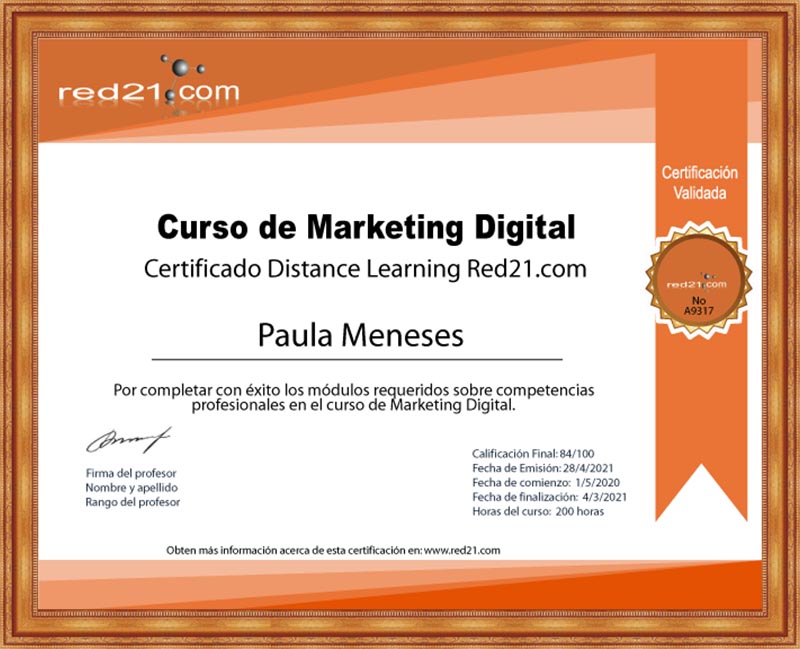 Al presentar, y aprobar la prueba final, recibirás un certificado de Aprobación del curso emitido por la Distance Learning Red21.com Corporate System reconocido por las principales empresas bajo la modalidad de enseñanza privada. A continuación un ejemplo de un certificado.