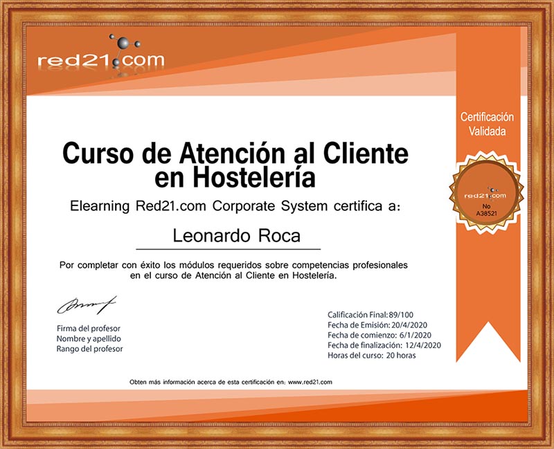Al presentar, y aprobar la prueba final, recibirás un certificado de Aprobación del curso emitido por la Distance Learning Red21.com Corporate System reconocido por las principales empresas bajo la modalidad de enseñanza privada. A continuación un ejemplo de un certificado.