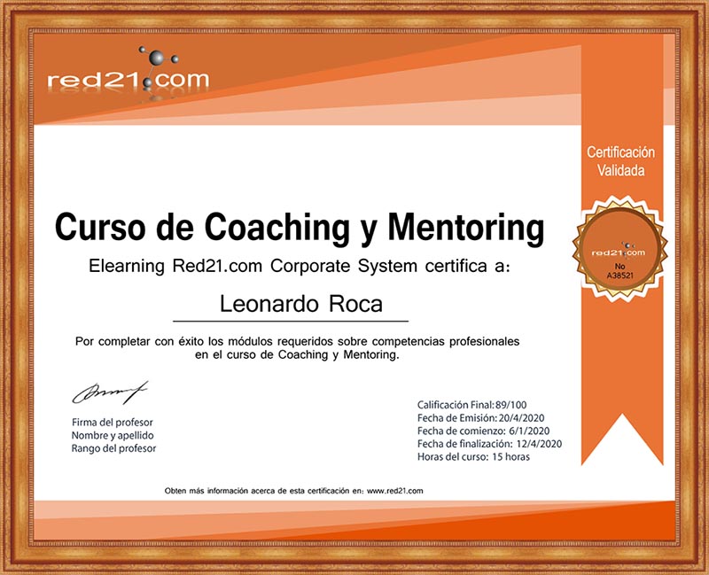 Al presentar, y aprobar la prueba final, recibirás un certificado de Aprobación del curso emitido por la Distance Learning Red21.com Corporate System reconocido por las principales empresas bajo la modalidad de enseñanza privada. A continuación un ejemplo de un certificado.