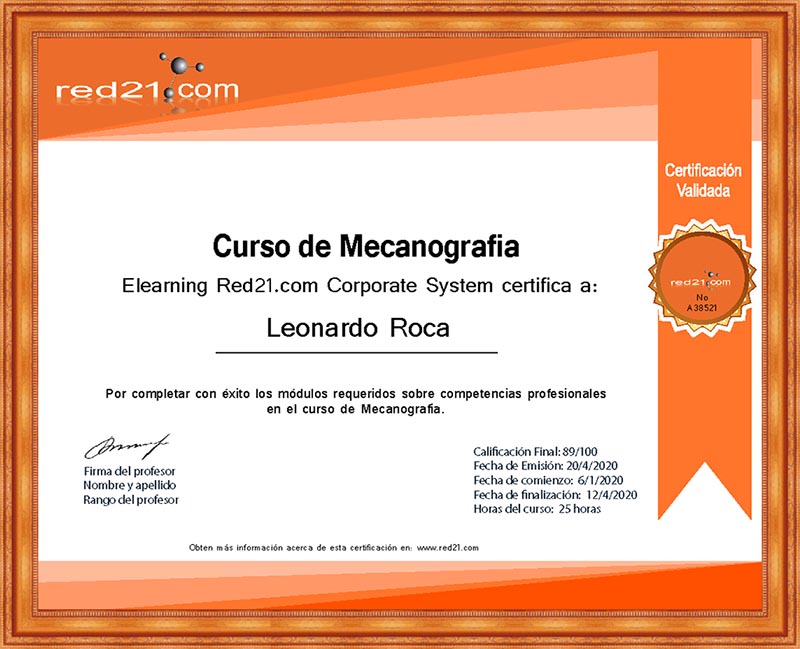 Al presentar, y aprobar la prueba final, recibirás un certificado de Aprobación del curso emitido por la Distance Learning Red21.com Corporate System reconocido por las principales empresas bajo la modalidad de enseñanza privada. A continuación un ejemplo de un certificado.