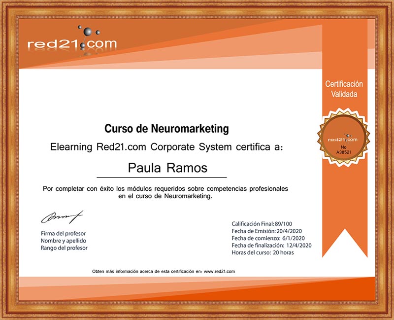 Al presentar, y aprobar la prueba final, recibirás un certificado de Aprobación del curso emitido por la Distance Learning Red21.com Corporate System reconocido por las principales empresas bajo la modalidad de enseñanza privada. A continuación un ejemplo de un certificado.