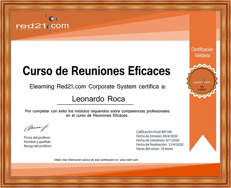 Al presentar, y aprobar la prueba final, recibirás un certificado de Aprobación del curso emitido por la Distance Learning Red21.com Corporate System reconocido por las principales empresas bajo la modalidad de enseñanza privada. A continuación un ejemplo de un certificado.